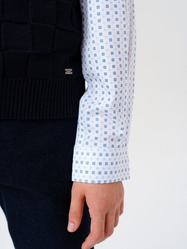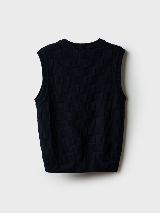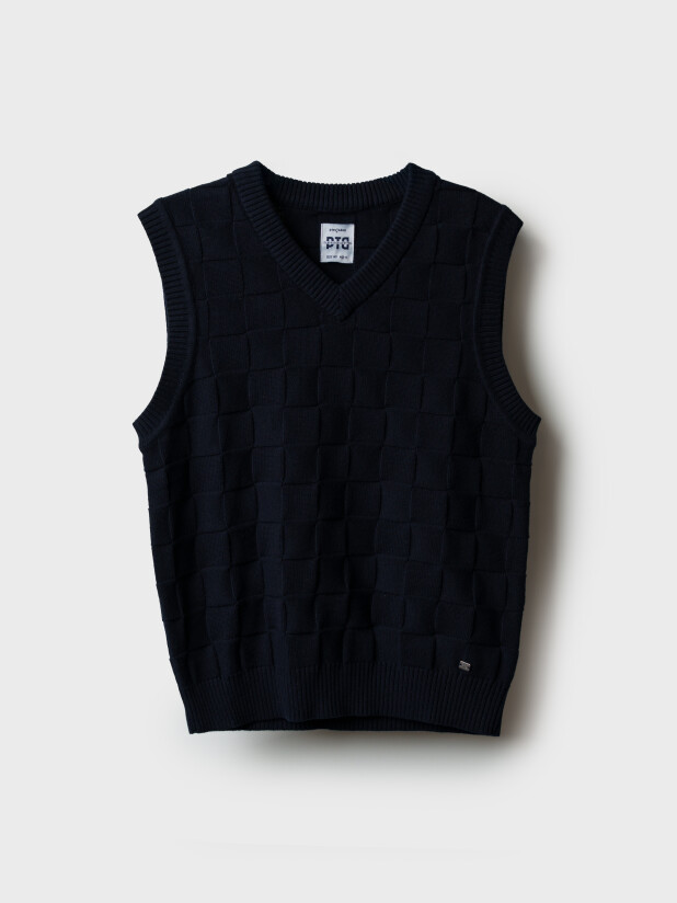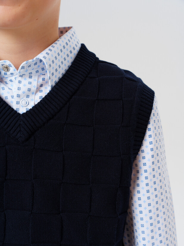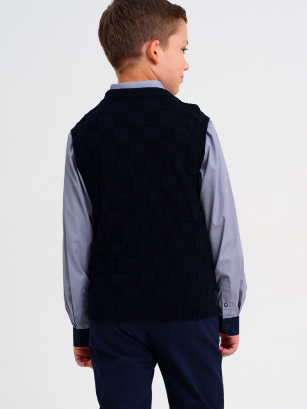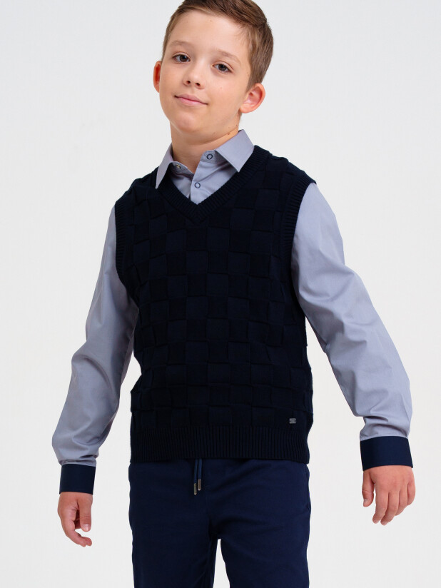 Классический синий школьный жилет для мальчика подростка. Жилет прямого силуэта выполнен из вязаного трикотажа из 100% хлопка, что обеспечивает максимальный комфорт для школьника во время занятий. Жилетка в школу выглядит стильно, благодаря лаконичному дизайну. Рубашка, футболка или поло + жилет для школьника составит красивый элегантный комплект для школы.