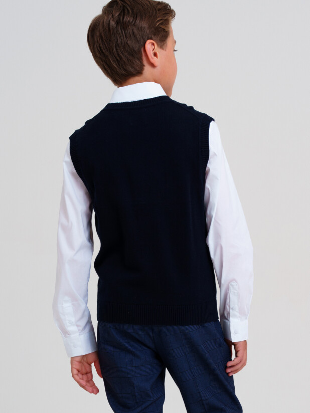 Этот синий подростковый жилет для школы отлично садится по фигуре, не стесняет движений и подходит для любого школьного образа. Прямой силуэт позволяет надевать классический трикотажный жилет для мальчиков поверх рубашки, футболки или поло — получится элегантный комплект для школы и особых случаев.