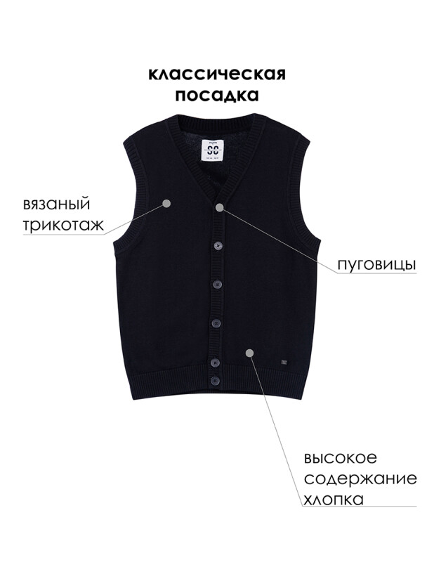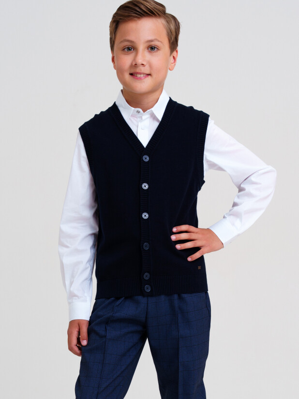 Классический темно-синий вязаный школьный жилет на пуговицах для мальчика подростка от PlayToday — стильный и удобный элемент школьного гардероба, созданный для максимального комфорта каждый день. Универсальный детский жилет прямого силуэта выполнен из вязаного трикотажа с высоким содержанием хлопка — мягкого, дышащего и приятного к телу материала.