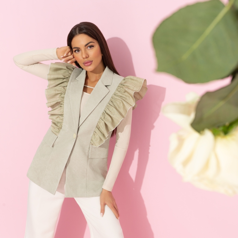 Керри Бредшоу предпочитала хранить деньги там, где их видно – в своем шкафу. Такая финансовая грамотность нам подходит. Сделайте вклад в виде жилета CHARUTTI. Беспрецедентная по выгоде сделка! Жакет однобортный с лацканами без рукавов. Имитация карманов. Симметричный объемный декор в виде рюш на передней и задней стороне изделия.