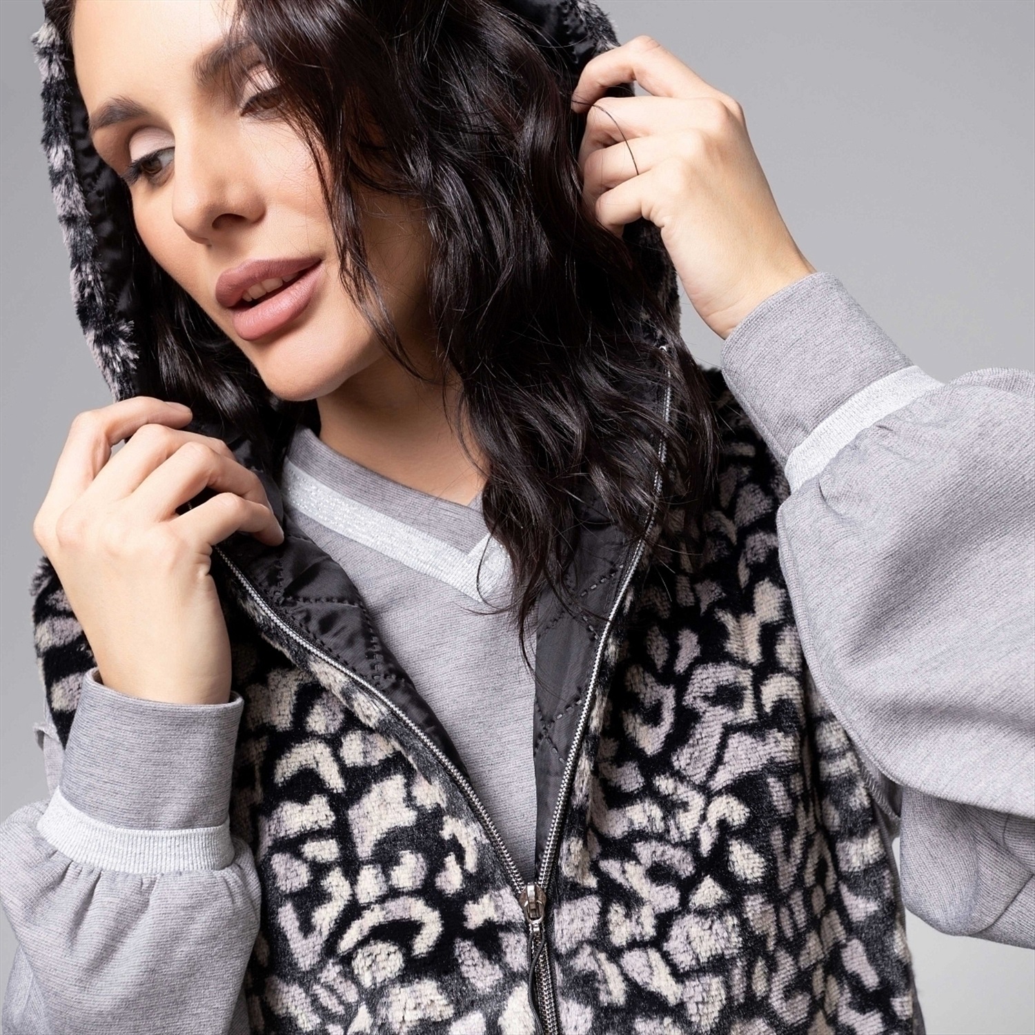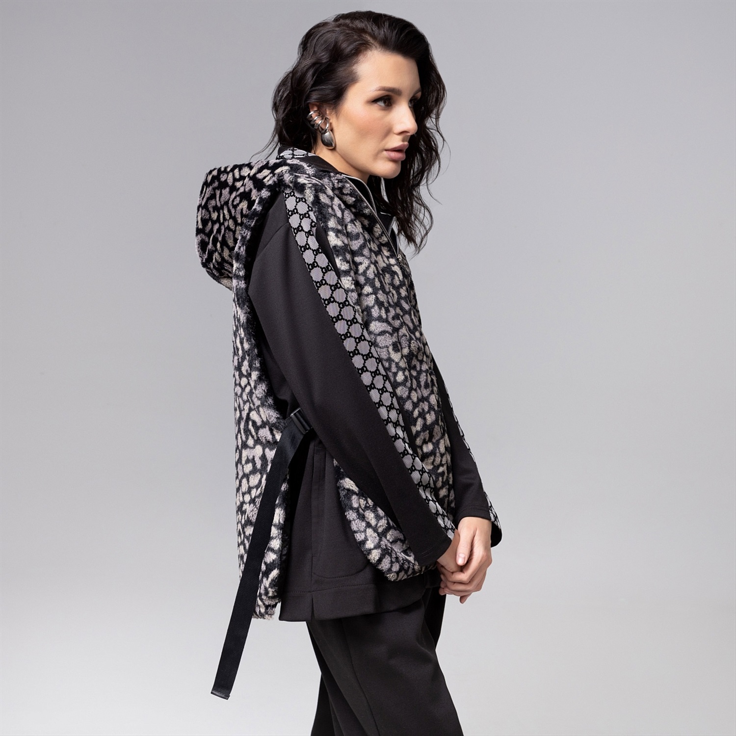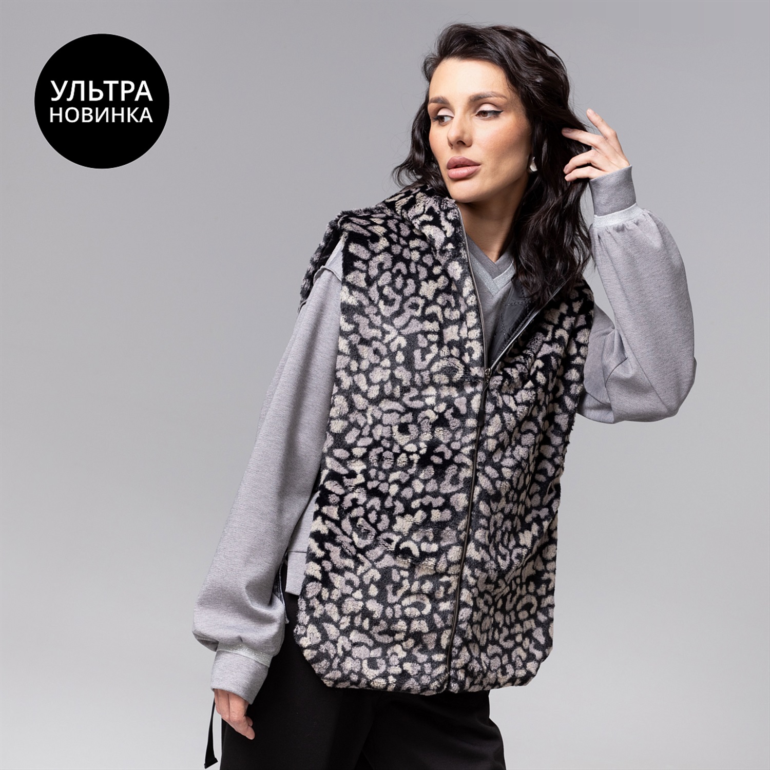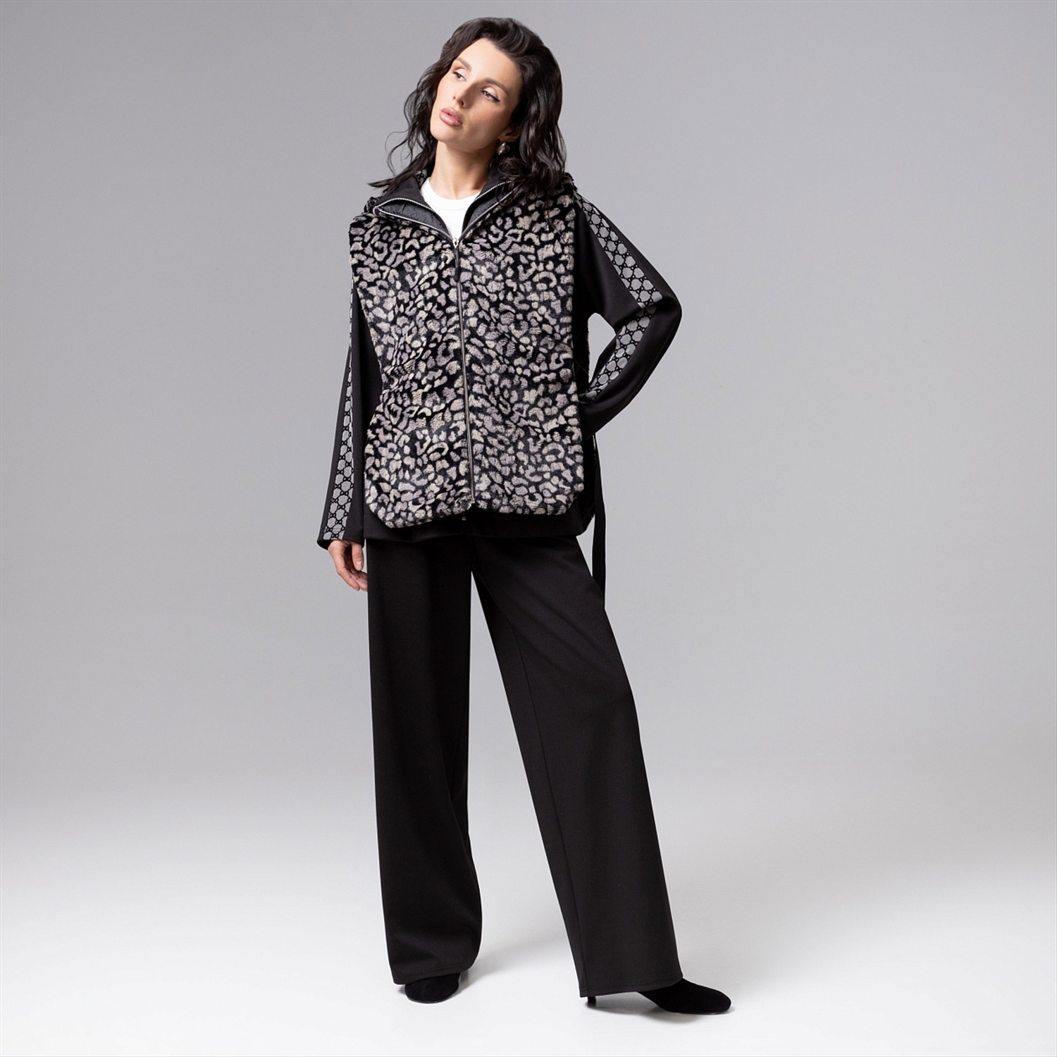 Жилет ЧАРУТТИ из экомеха с трендовым леопардовым принтом воплощает дерзкую элегантность. Экстравагантный крой и дикий узор создают смелый стильный акцент. Изделие с объемным капюшоном подчеркивает динамику силуэта, добавляя образу ноту современной роскоши и непринужденного шика. Безупречный пошив проявляется в виртуозном совмещении принта, идеальной посадке и тщательной обработке деталей, обеспечивающих комфорт в носке и долговечность изделия. Жилет на стёганом подкладе. Застежка на молнию. Можно носить как верхний, и как нижний слой под верхнюю одежду. Ширина изделия регулируется по бокам.