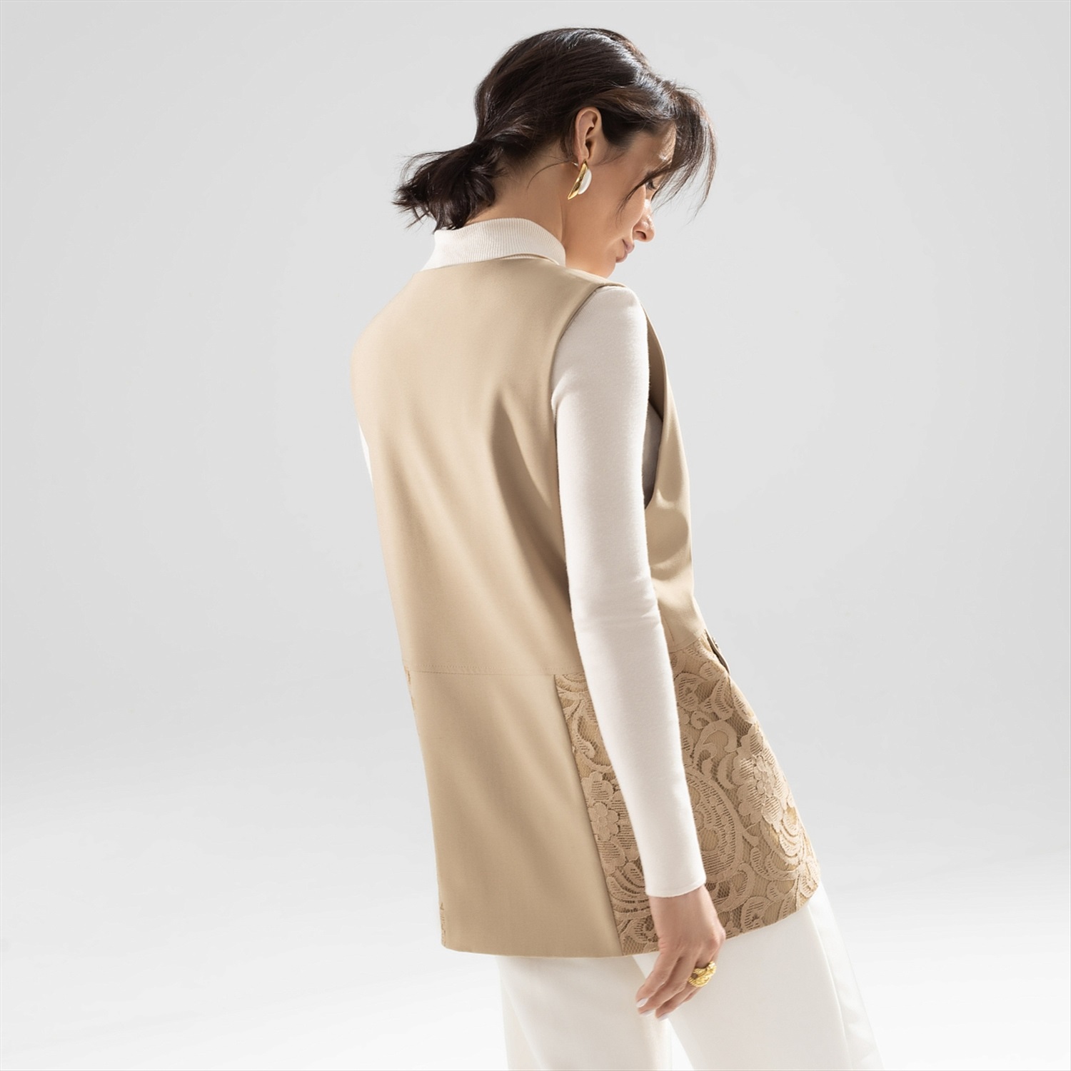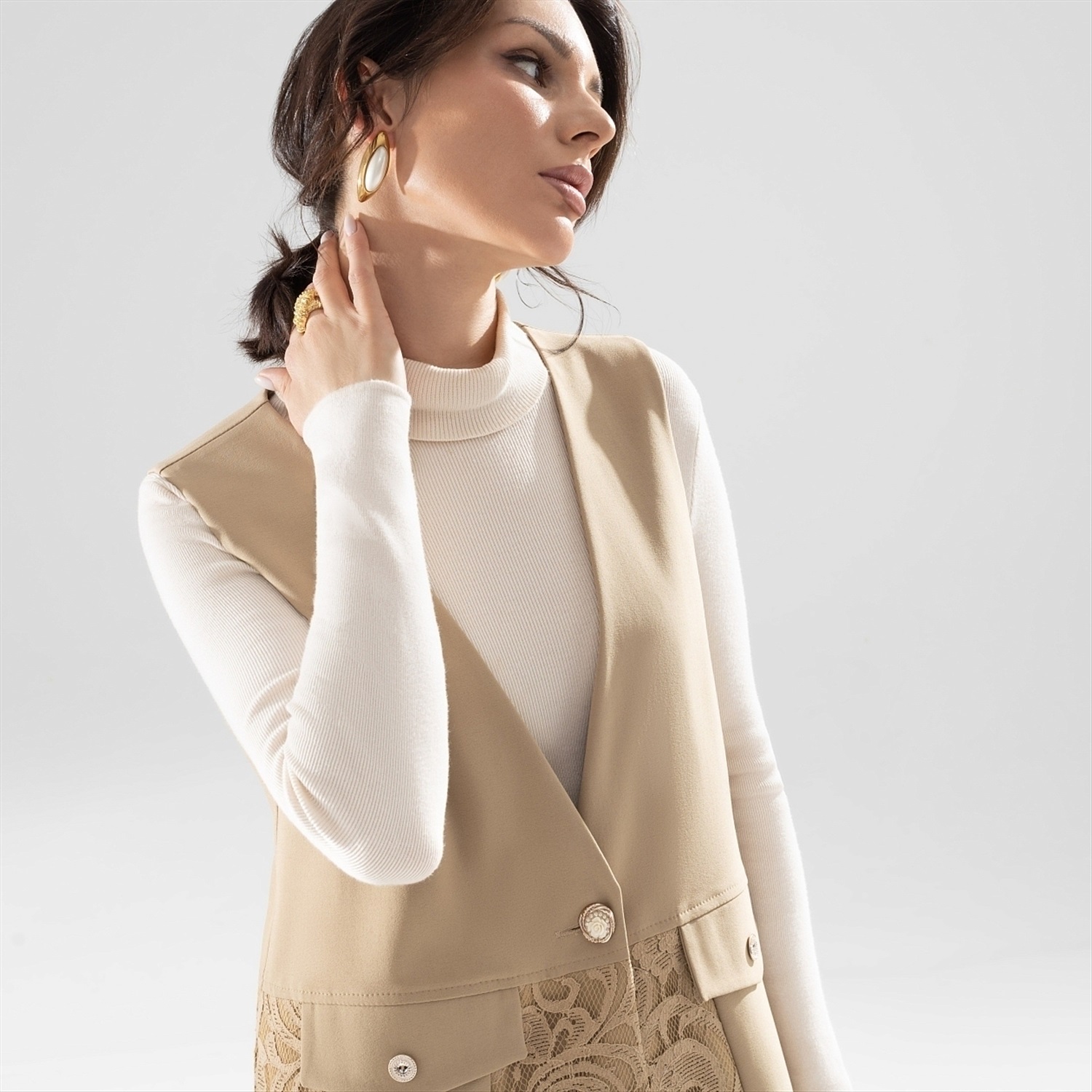 Все лучшие качества жилета воплощены в нем – удлиненный, элегантный, легкий и нарядный. Жилет CHARUTTI задуман как совершенство. Дополнен кружевом и фурнитурой премиального качества. Жилет удлиненный прямого кроя. Застегивается на пуговицу в тон изделия. Есть подклад. Имитация карманов. Кружевной материал как второй слой, вшит в изделие.
