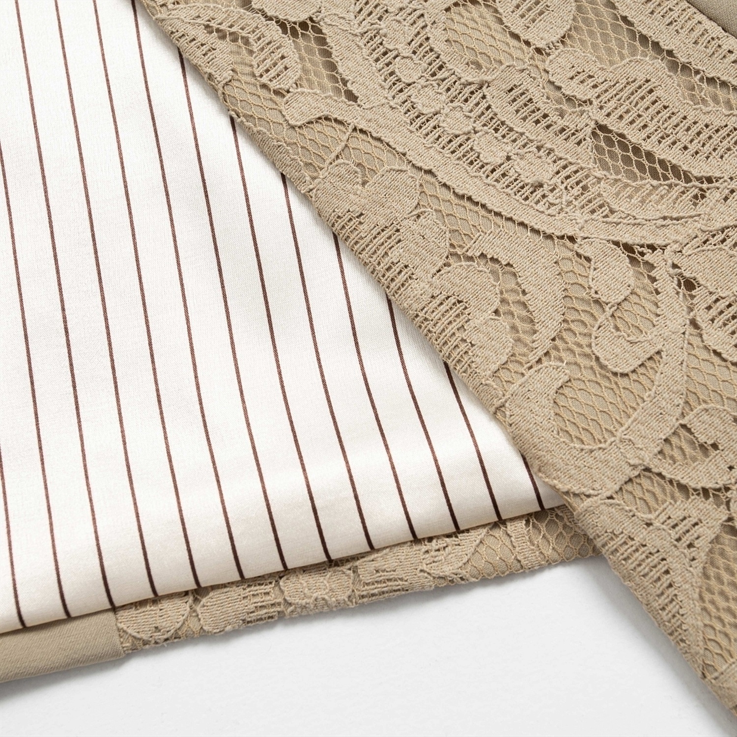 ТН ВЭД: 6211490009; Состав: Костюмная ткань «пикачу», «кружево», «атлас» (75% полиэстер, 20% хлопок, 5% спандекс); Плотность ткани: Средняя; Тип ткани: Текстиль; Вид застежки: Пуговица/-ы; Карманы: Нет; Основной цвет ткани: Бежевый; Отрезная талия: Нет; Подклад: Есть; Резинка по талии: Нет; Рисунок/раппорт: Нет, все изделия идентичны; Сезон: Круглогодичный