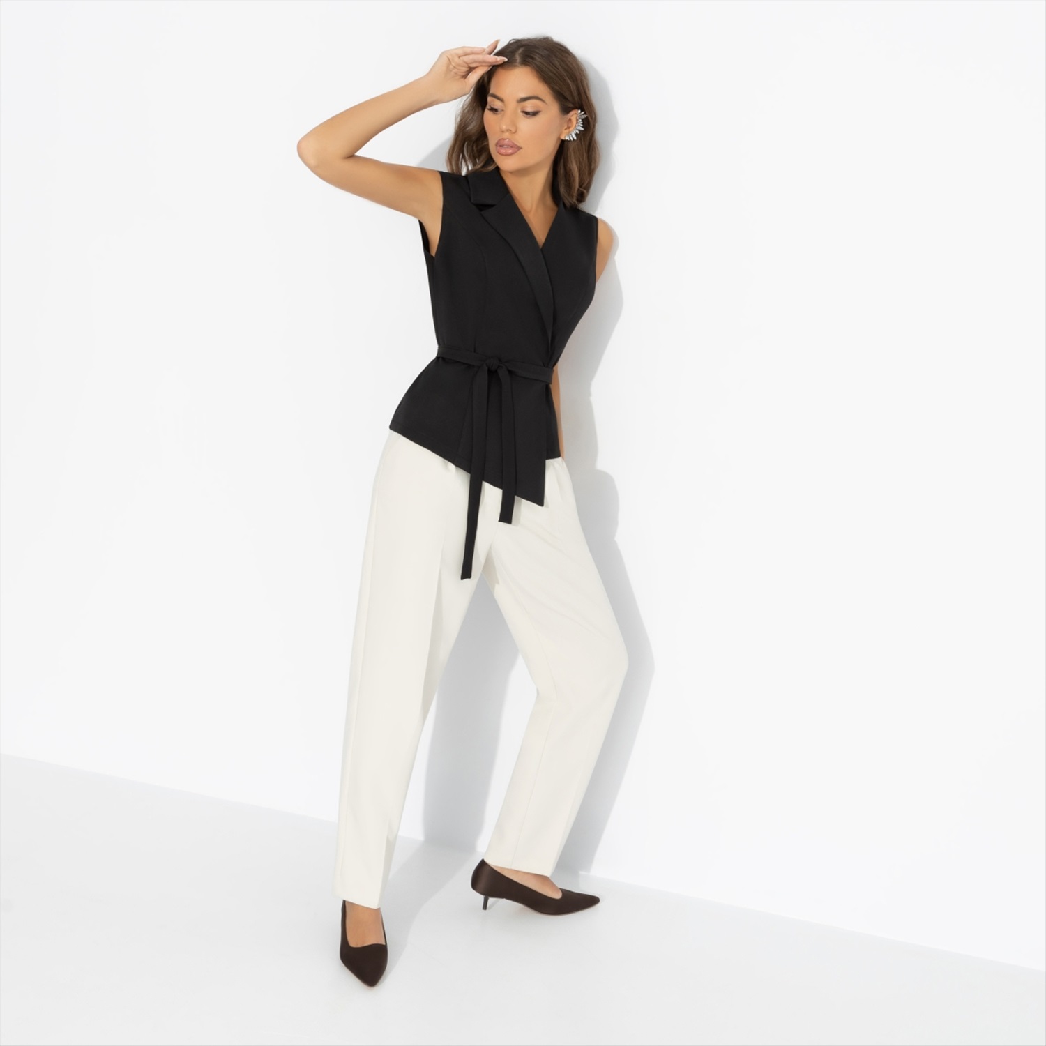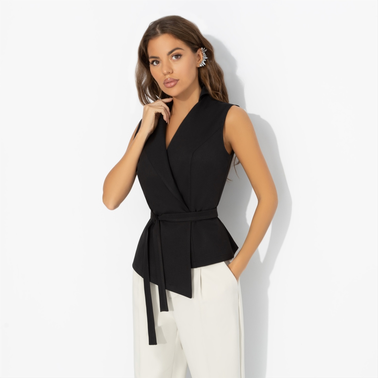 Мягкая драма, визуальная чёткость и деликатная женственность ‒ удивляй всех грацией, словно на сцене во время награждения. В сочетании с белыми брюками (или любимыми джинсами) жилет делает тебя объектом восхищённых взглядов. Приталенный жилет без рукавов, с запахом и поясом на талии ‒ идеально скульптурирует силуэт. Выполнен из костюмной ткани ‒ лёгкой, пластичной и гладкой. Универсальный чёрный цвет для самых смелых миксов.