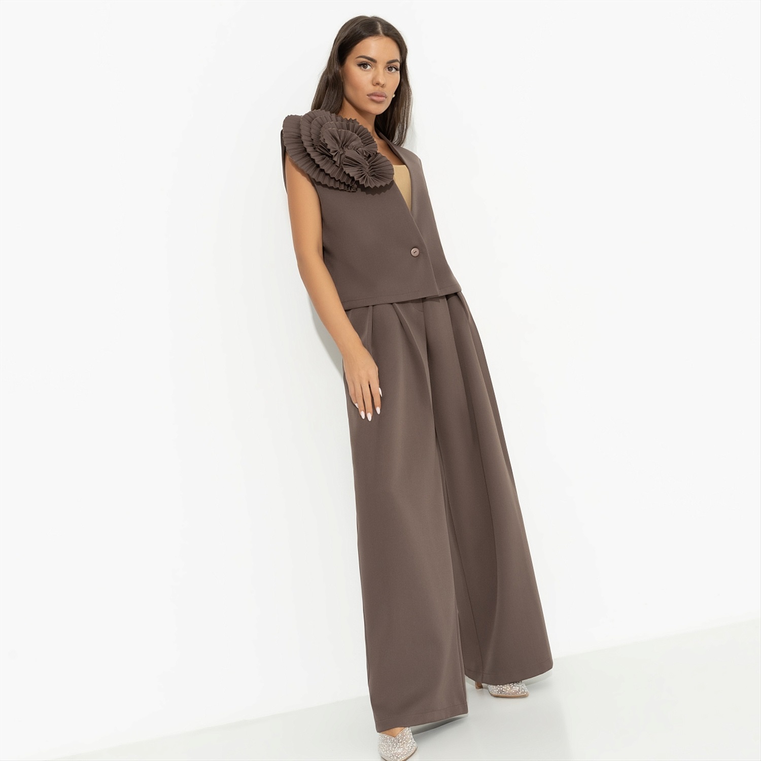 Вам необходим стильный и универсальный элемент гардероба, который подчеркнёт вашу индивидуальность и стремление к моде? Жилет свободного кроя «Жду продолжения (brown)» от CHARUTTI – это именно то, что вы ищете. Изготовленный из качественной костюмной ткани, этот жилет воплощает в себе современные тенденции и элегантность. Тренд на объём, который захватывает подиумы по всему миру, теперь доступен и вам, но в более утончённой форме. Этот жилет не просто укороченный, он создан, чтобы стать акцентом вашего образа, благодаря объемному декору в тон изделия. Пуговица в тон завершает образ, добавляя нотку изысканности.
