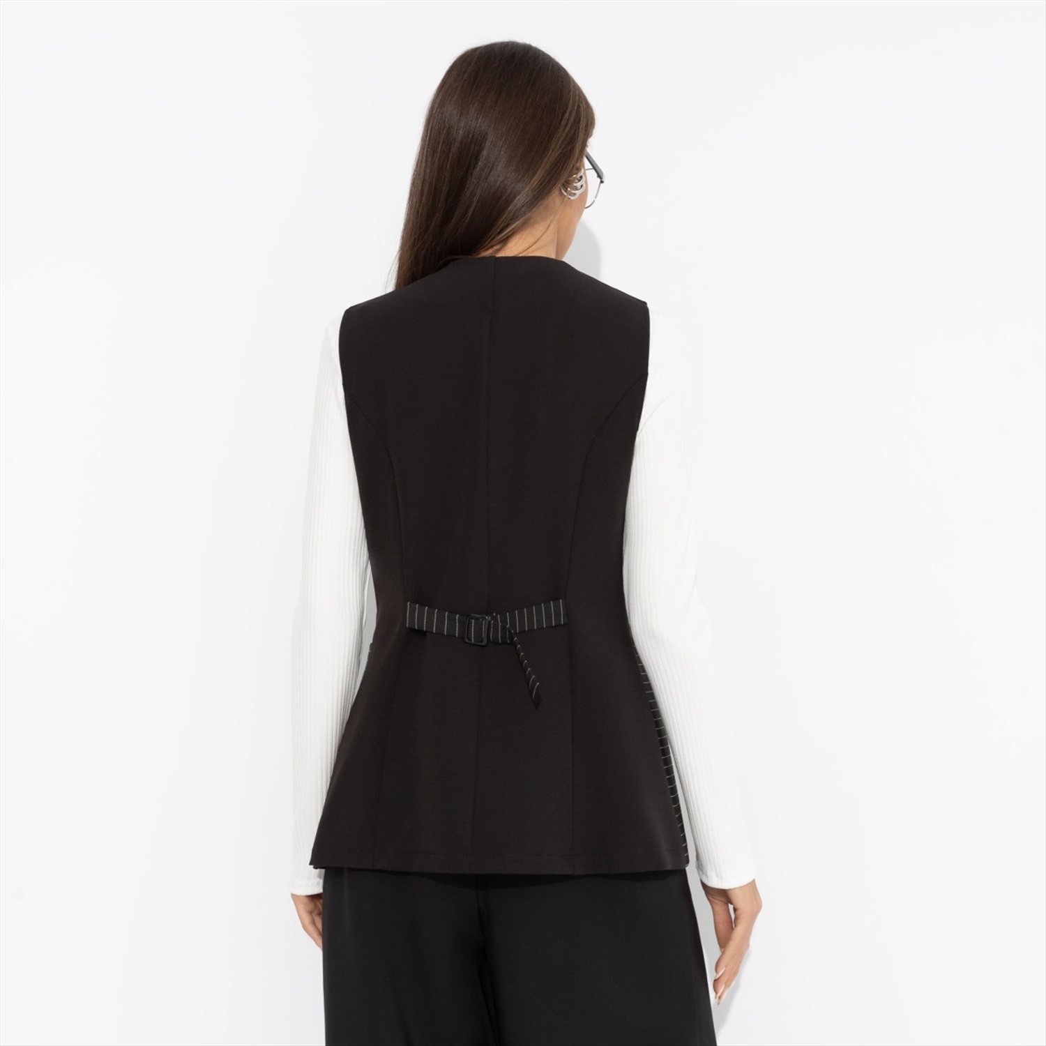 Тонкая контрастная полоска жилета ЧАРУТТИ – не просто принт. Это визуальная метафора: баланс между смелостью и элегантностью, между офисом и вечеринкой. Надень жилет поверх блузы или с голыми плечами и пусть каждый поймёт – перед ним человек, который диктует правила. Жилет приталенного силуэта, удлиненный. Изделие с карманами. Акцентный короткий ремешок по спинке изделия.