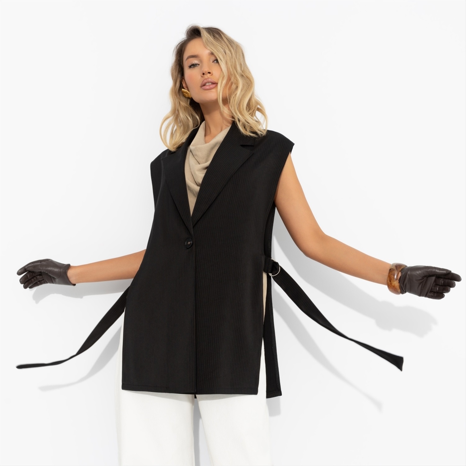 ТН ВЭД: 6211490009; Состав: Костюмная ткань «тиар» (65% п/э, 30% вискоза, 5% спандекс); Плотность ткани: Плотная; Тип ткани: Текстиль; Вид застежки: Пуговица/-ы; Декоративные элементы: Завязки; Дополнительный цвет ткани: Коричневый; Карманы: Нет; Основной цвет ткани: Черный; Отрезная талия: Нет; Подклад: Нет; Резинка по талии: Нет; Рисунок/раппорт: Нет, все изделия идентичны; Сезон: Круглогодичный; Силуэт: Свободный