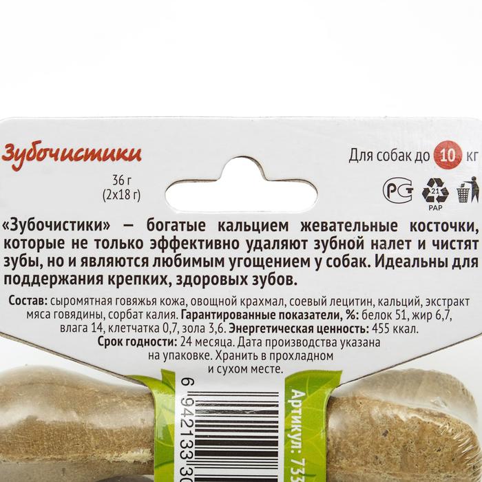ЗУБОЧИСТИКИ - это лучшие лакомства для чистки зубов на основе прессованной сыромятной кожи, отлично снимают зубной налет, предотвращают появление зубного камня и борются с болезнями десен. Запатентованная структура делает косточку достаточно жесткой, что обеспечивает максимально эффективную чистку зубов, сопоставимую с механической.