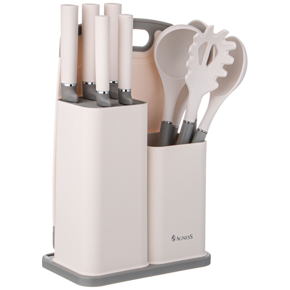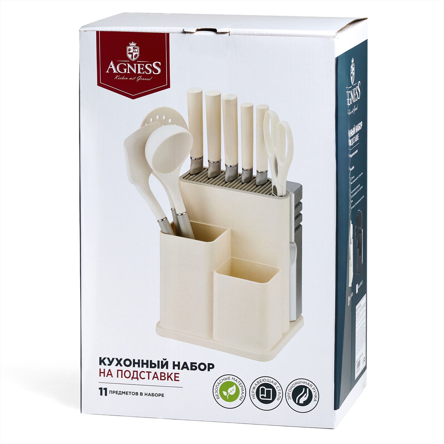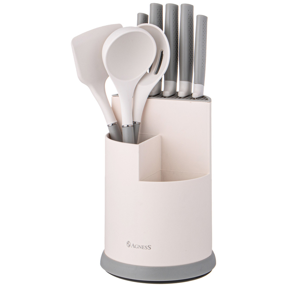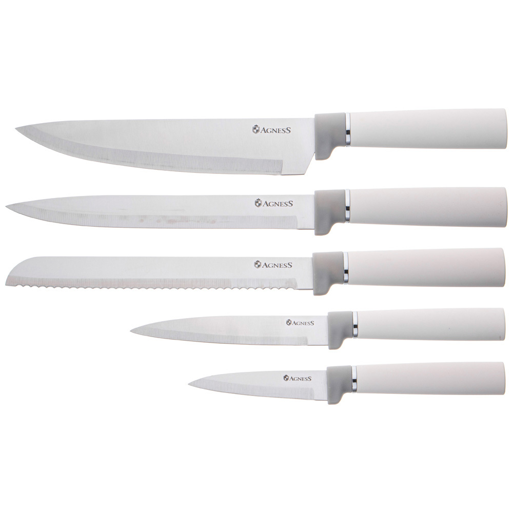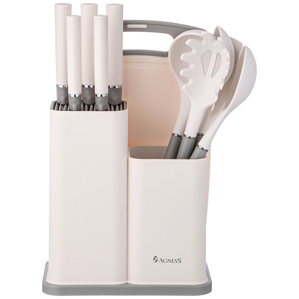 НАБОР AGNESS ИЗ 11ПР: 5 НОЖЕЙ,ПОЛОВНИК,ЛОПАТКА,ШУМОВКА,ПОДСТАВКА,НОЖЕТОЧКА,НОЖНИЦЫ, ЦВЕТ:БЕЛЫЙ/СЕРЫЙ 9 фото