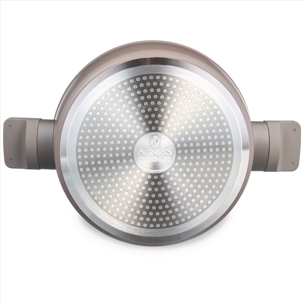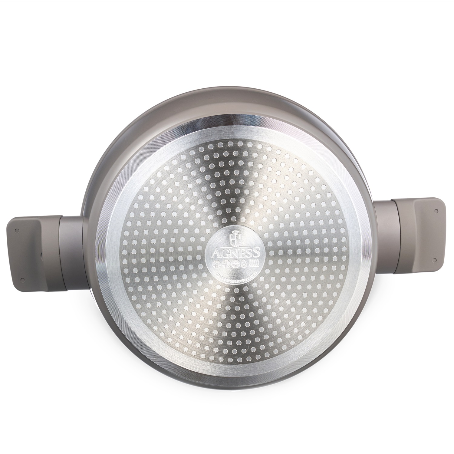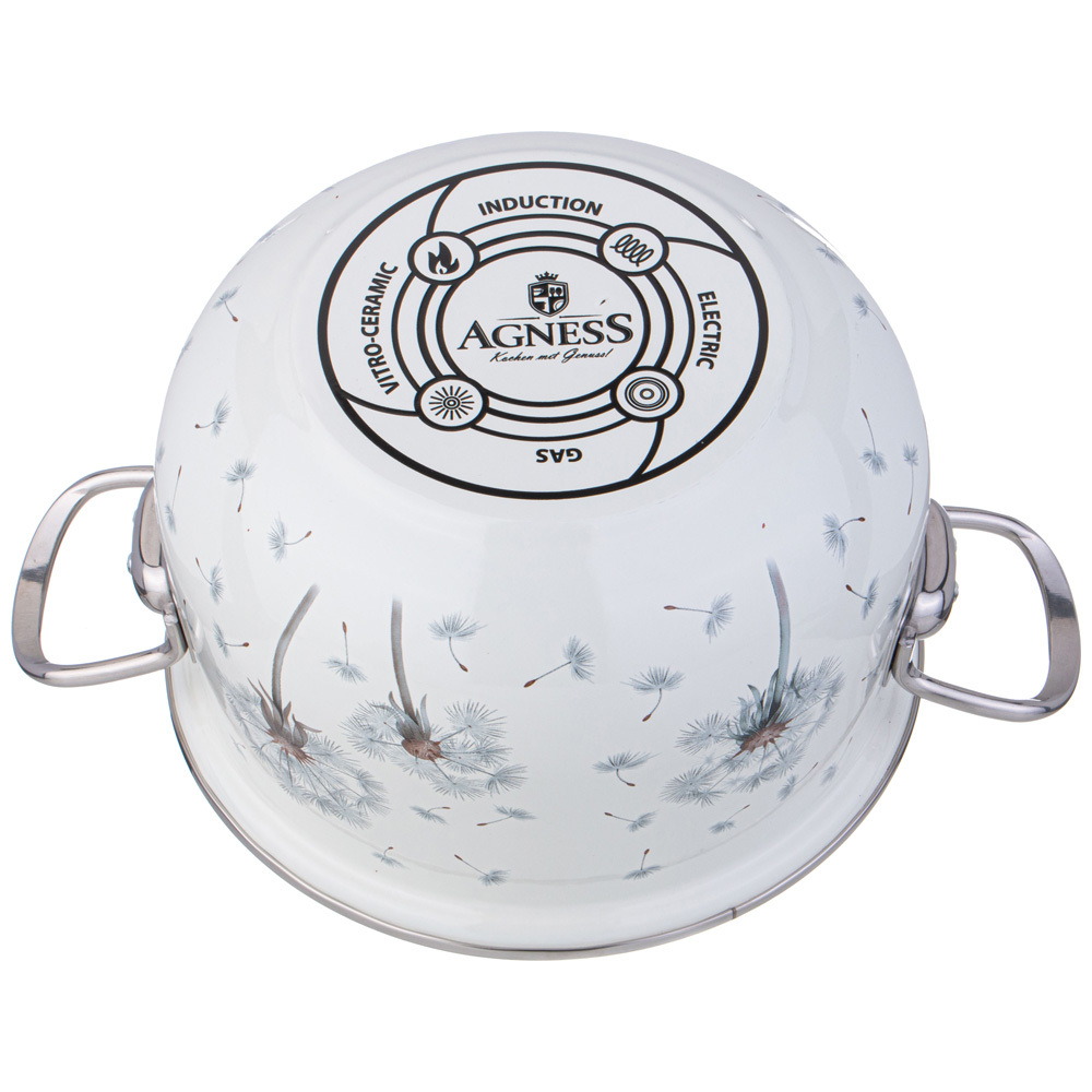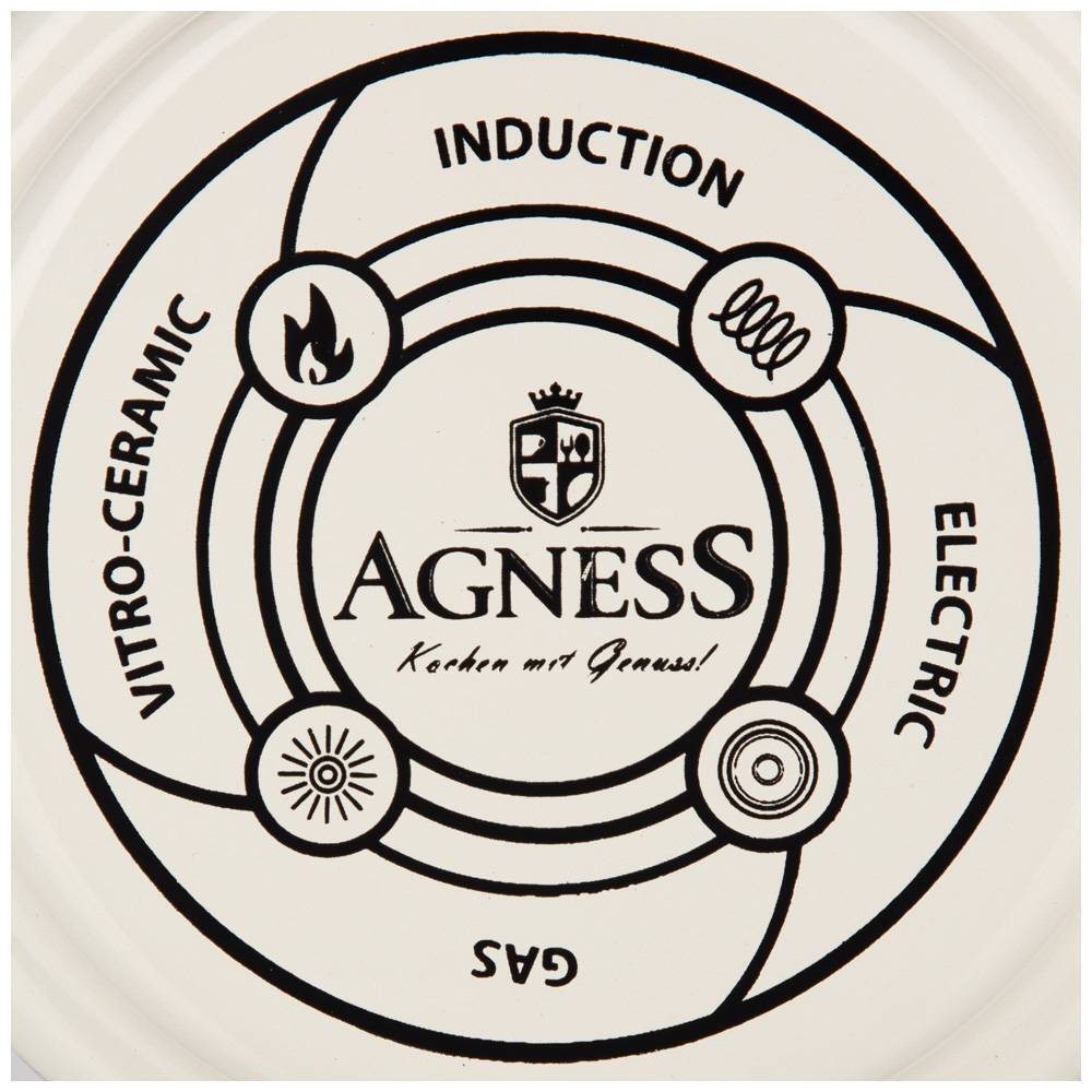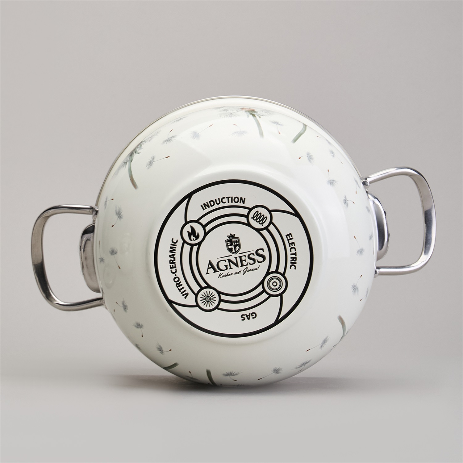 Посуда для приготовления Agness выполнена из качественной стали. В нашем интернет магазине выставлен большой ассортимент деколированных изделий с эмалированным покрытием.  Эмаль устойчива к пищевым кислотам, не вступает во взаимодействие с продуктами и не искажает их вкусовые качества. Эмалевое покрытие не вызывает аллергию и надежно защищает пищу от контакта с металлом.  Подходит для всех типов плит, включая индукционные. Подходит для мытья в посудомоечной машине.