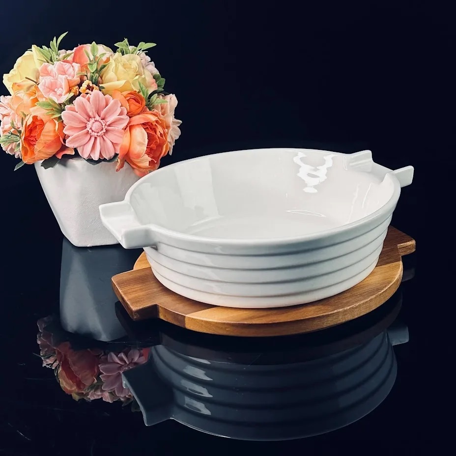 142-118 Круглое блюдо для запекания 24см с дерев.крышкой/подставкой в под.уп.(х12)Фарфор 2 фото