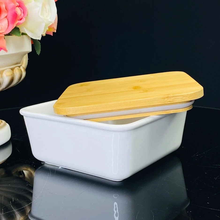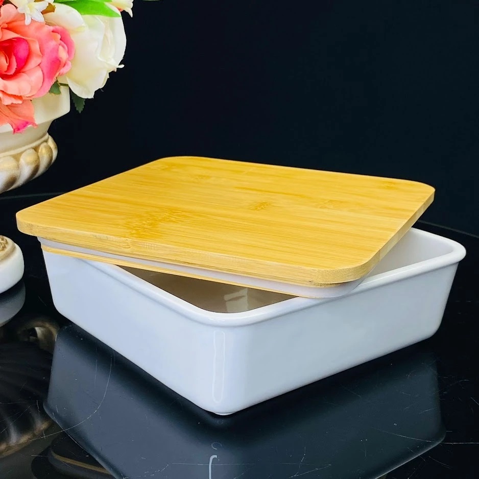 142-087 Квадратное блюдо для запекания 15см с бамбук.крышкой в под.уп.(х16)Фарфор 3 фото