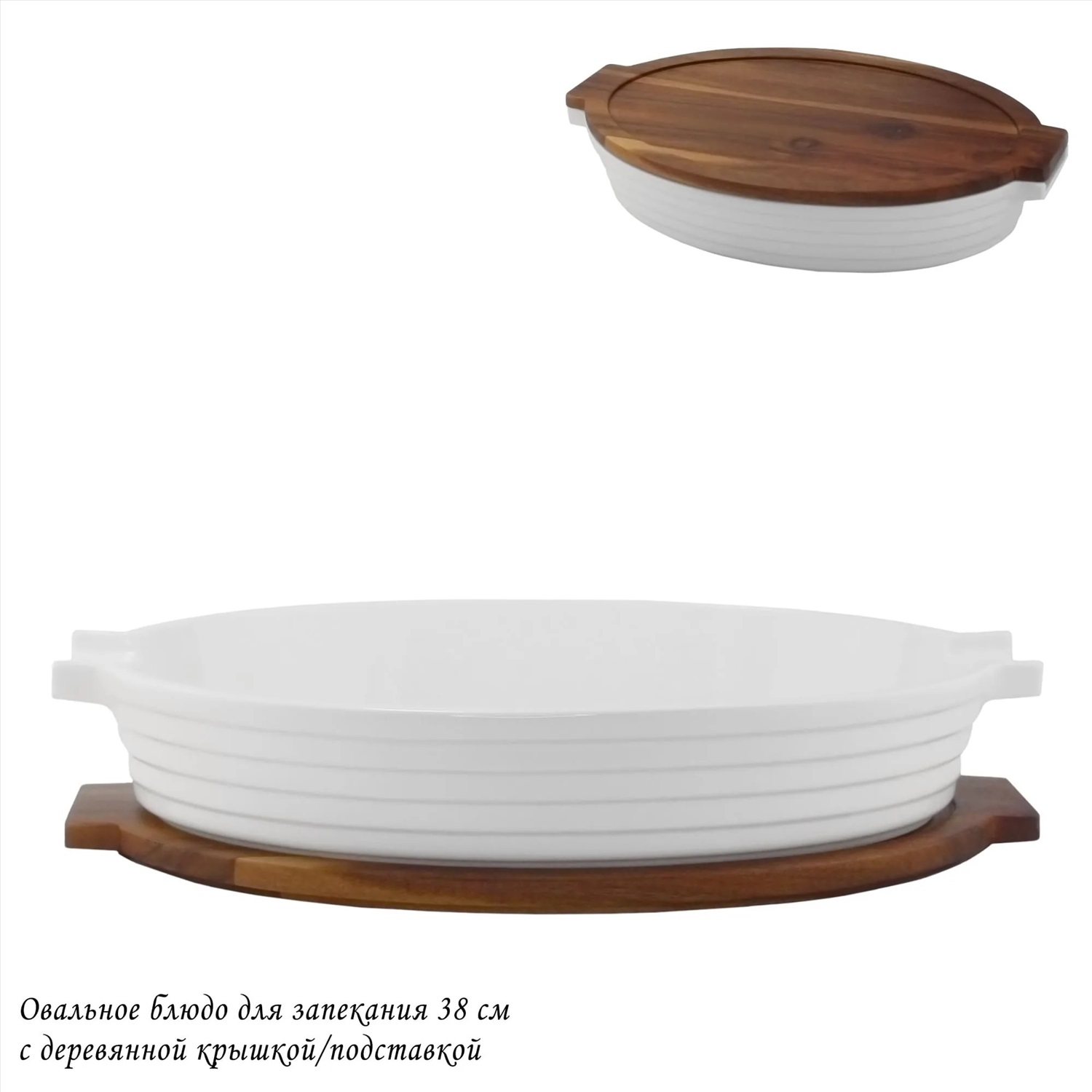 142-117 Овальное блюдо для запекания 38см с дерев.крышкой/подставкой в под.уп.(х6)Фарфор 2 фото