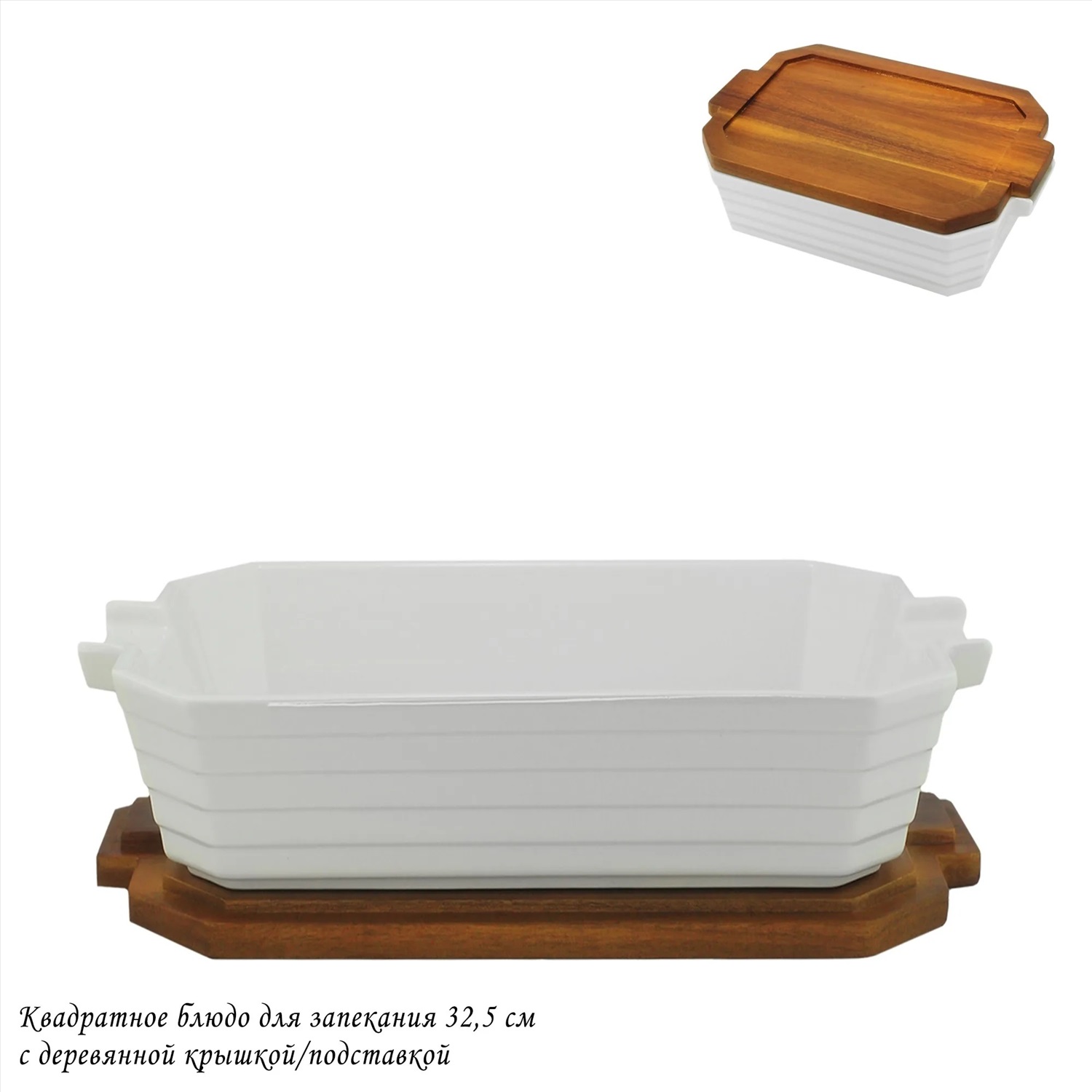 142-114 Квадратное блюдо для запекания 32,5см с дерев.крышкой/подставкой в под.уп.(х6)Фарфор 2 фото