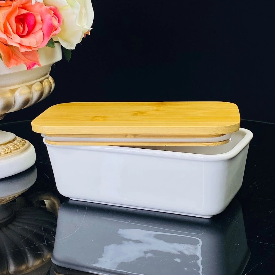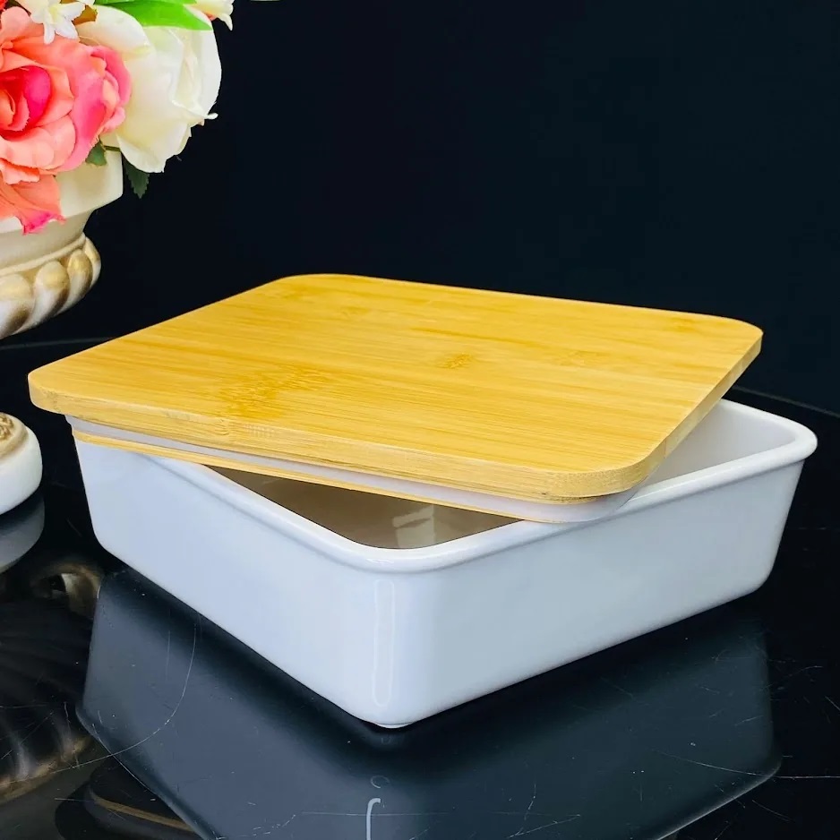 142-084 Прямоугольное блюдо для запекания 19см с бамбук.крышкой в под.уп.(х16)Фарфор 3 фото
