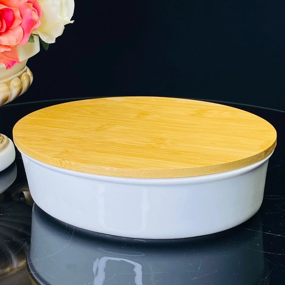 142-089 Круглое блюдо для запекания 16см с бамбук.крышкой в под.уп.(х16)Фарфор 3 фото