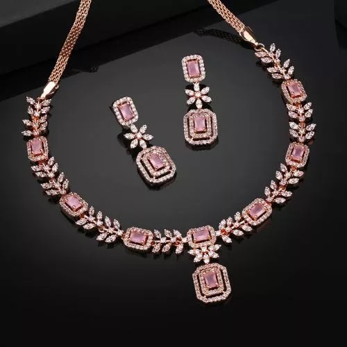 Estele Rose Gold Plated CZ Classic Designer Necklace Set with Mint Pink Stones for Women