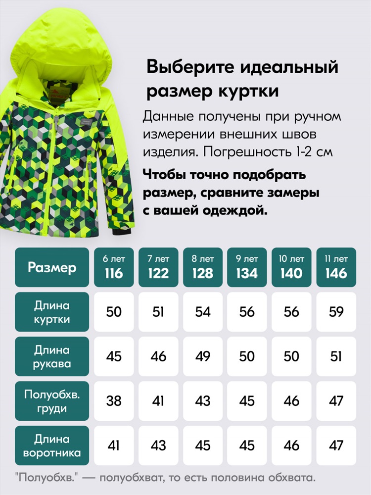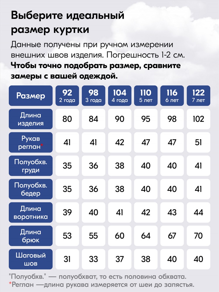Размеры: 92 (2 года), 98 (3 года), 104 (4 года), 110 (5 лет), 116 (6 лет), 122 (7 лет)