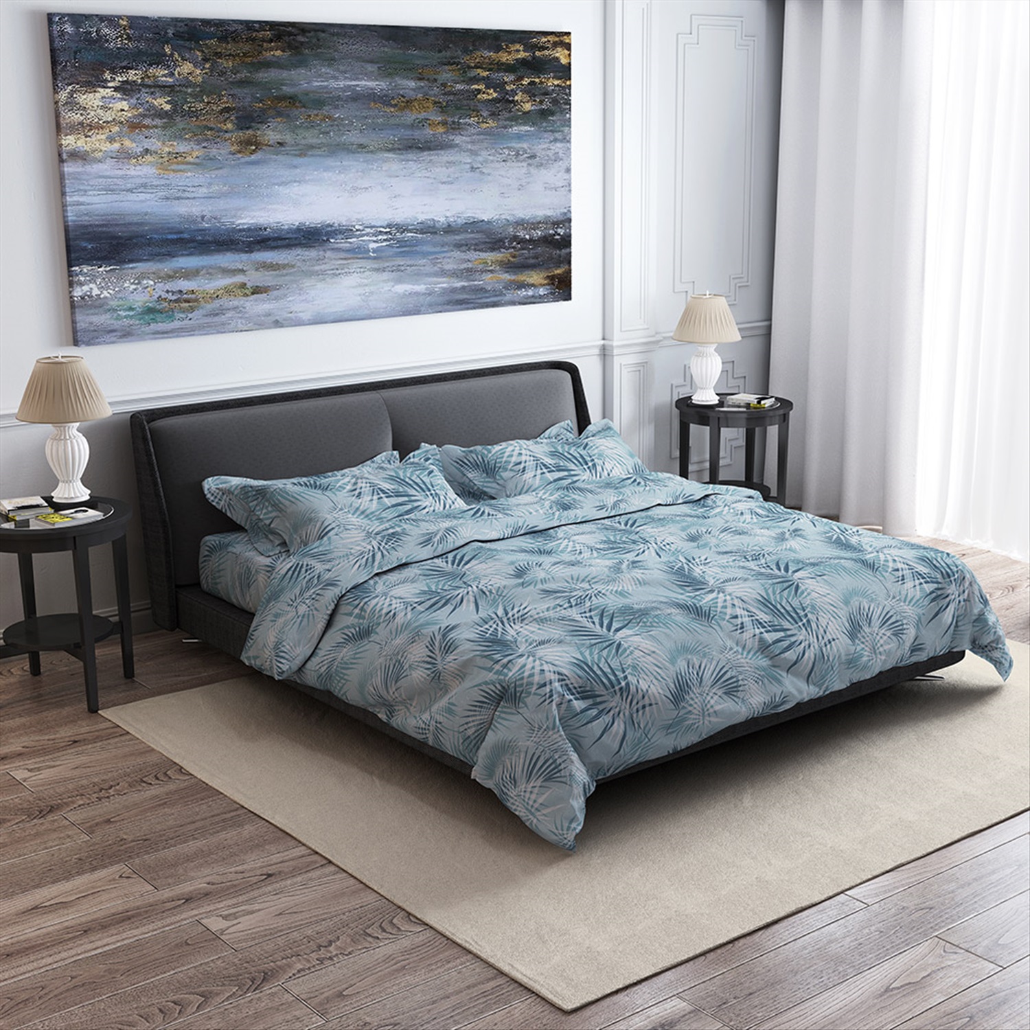 Постельное белье, комплект 1,5 спальный "Эвкалипт, синий б/з", 4 предмета: пододеяльник 145х215см, простыня классическая 150х220см, 2 наволочки 70х70см с клапаном-запахом, бязь "Комфорт" 121г/м2, хлопок 100%, упаковка "классическая" ПВХ 32х41см, "Дом