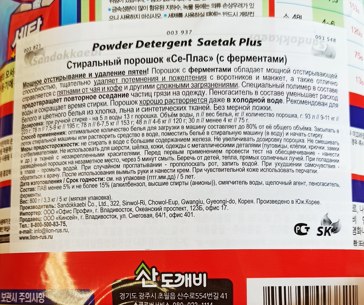 Стиральный порошок «Се-Плас» (с ферментами), SANDOKKAEBI 800 г (мягкая упаковка) 3 фото